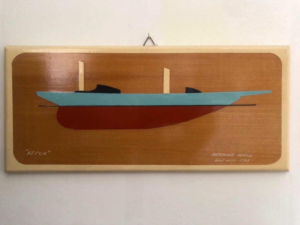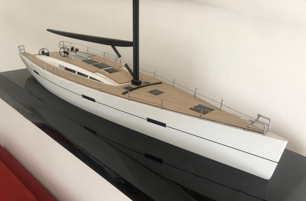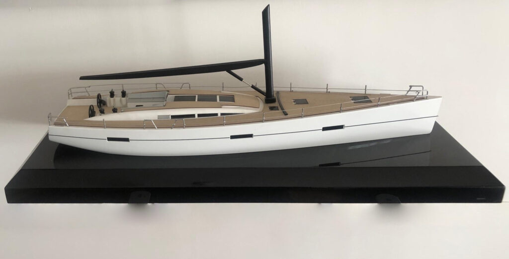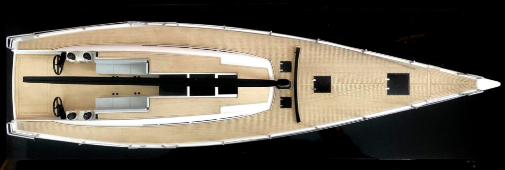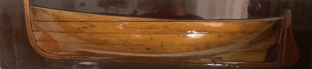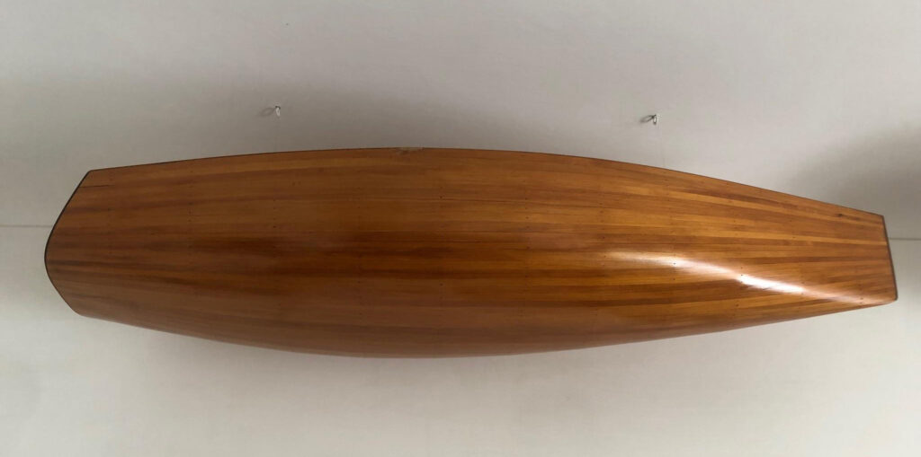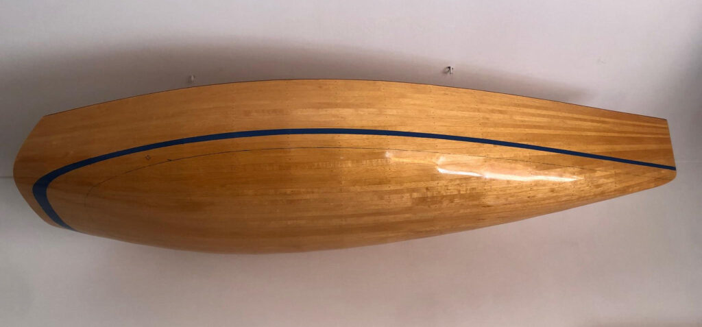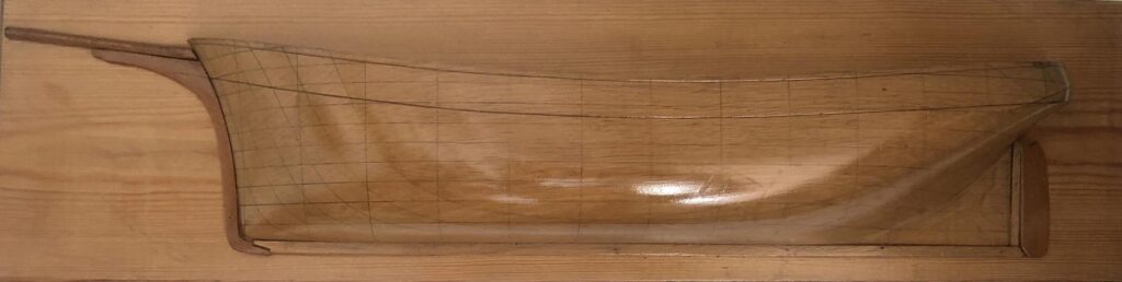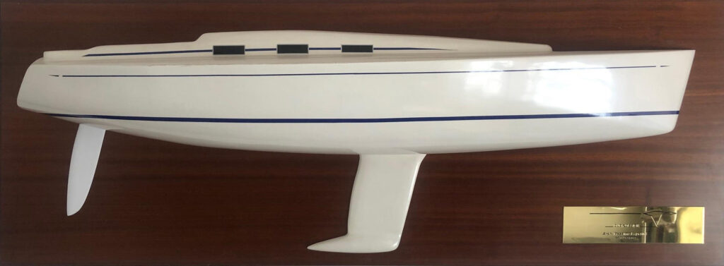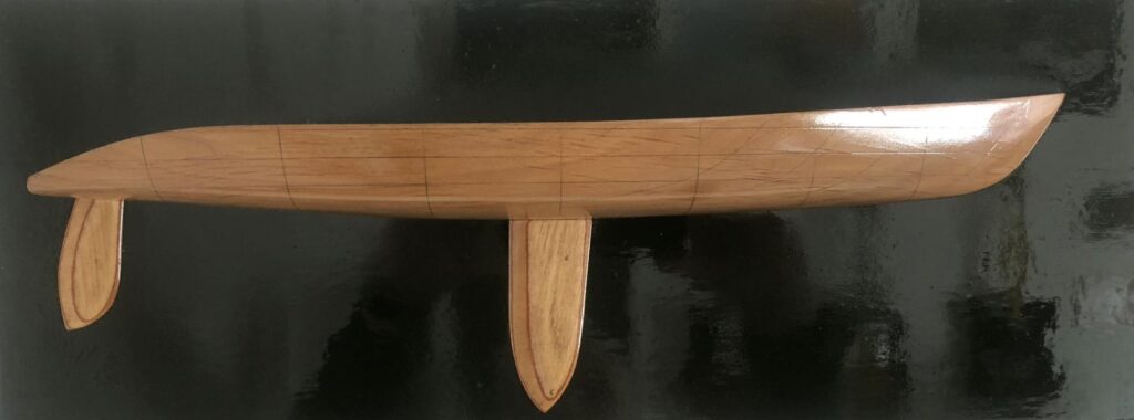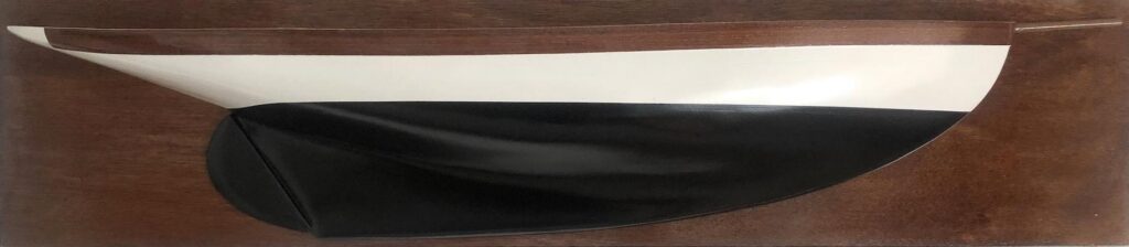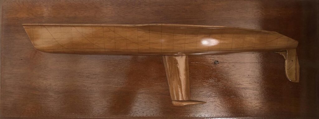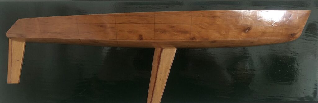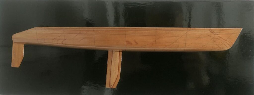 C – Hull with keel,rudder, deck equipment and partial mast, on cradle